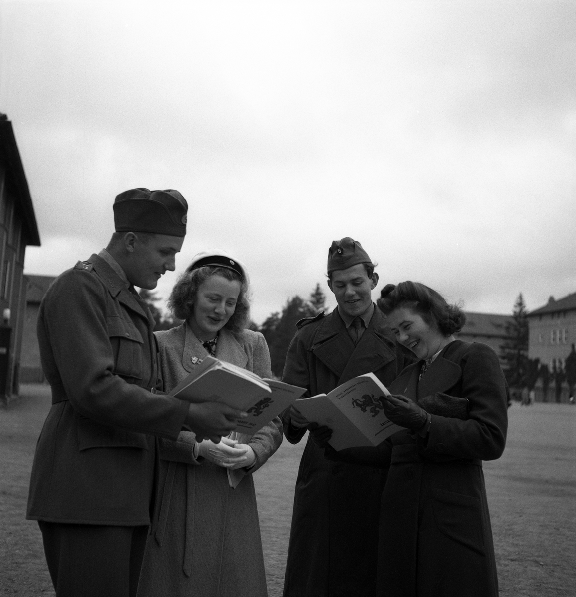 Försvarets dag. Några soldater i uniform förevisar något i några böcker, för