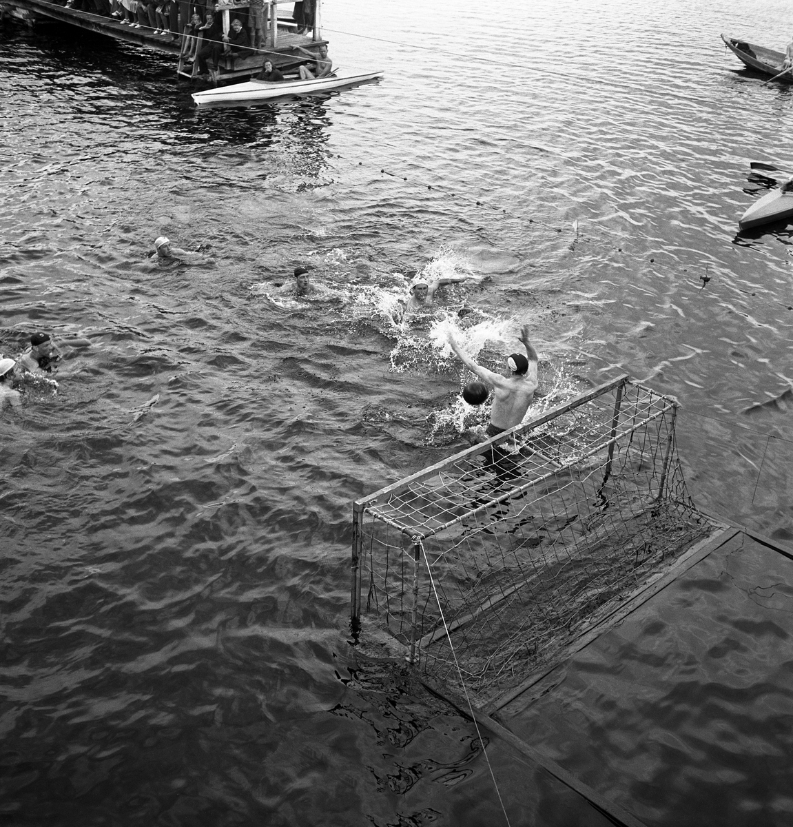 Vy över tävlingsbassängen, under pågående vattenpolomatch. Ena lagets målbur.