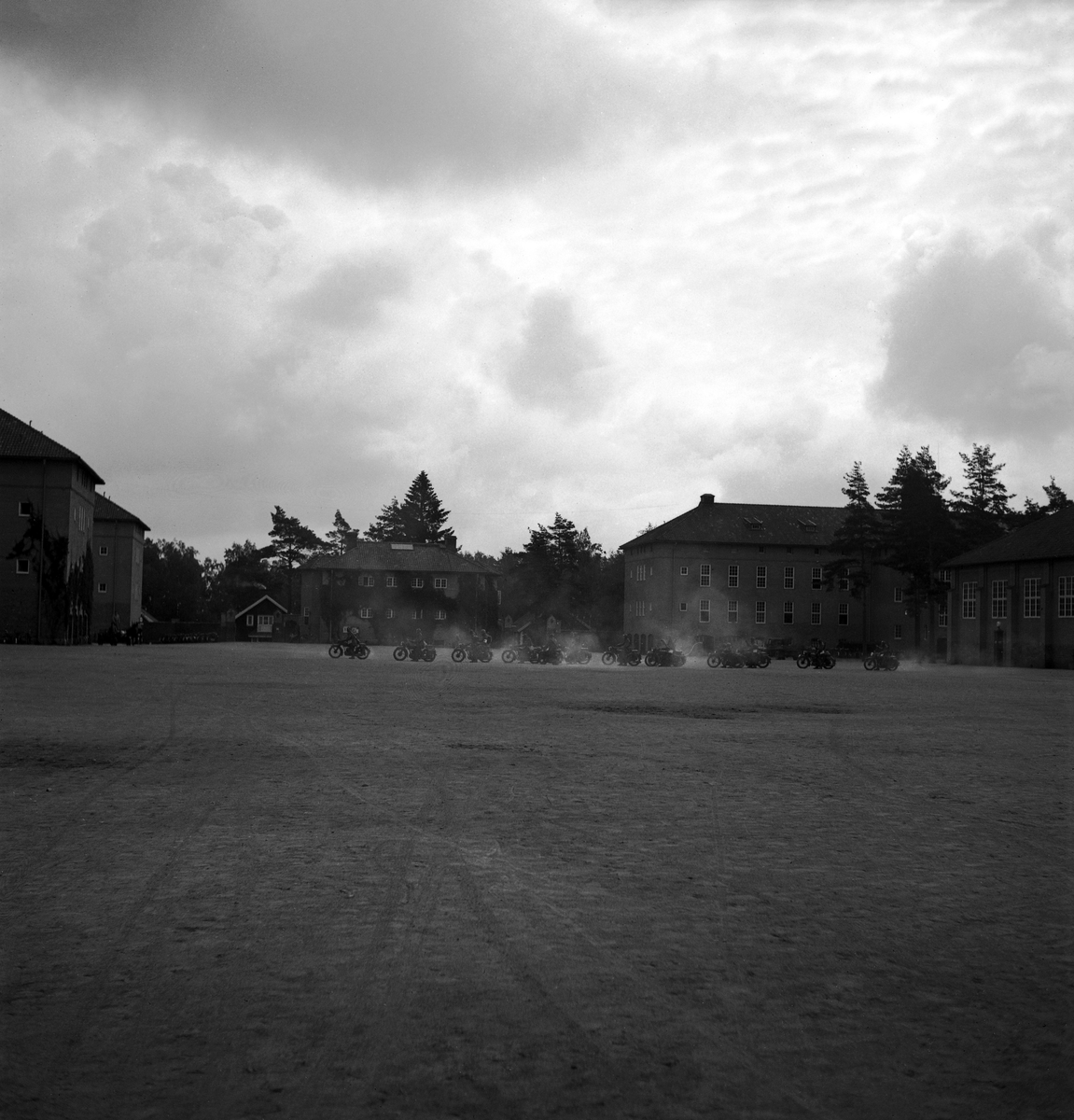 Ett antal män med motorcyklar "gasar på" på kaserngården, I 11, Växjö.