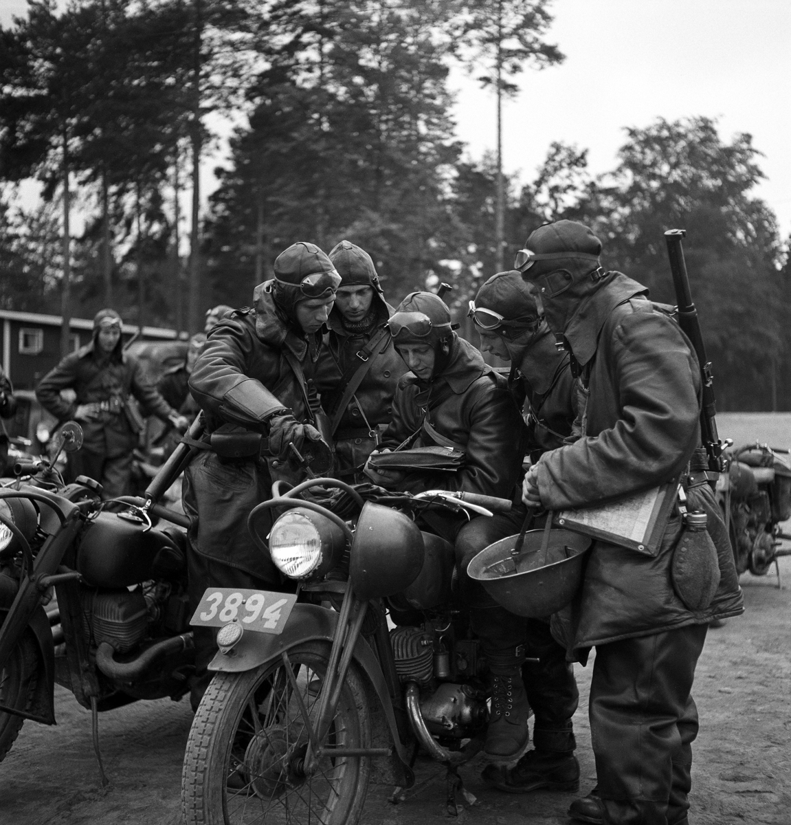 Några män på motorcyklar läser något ur en bok (?) på kaserngården, I 11, Växjö.