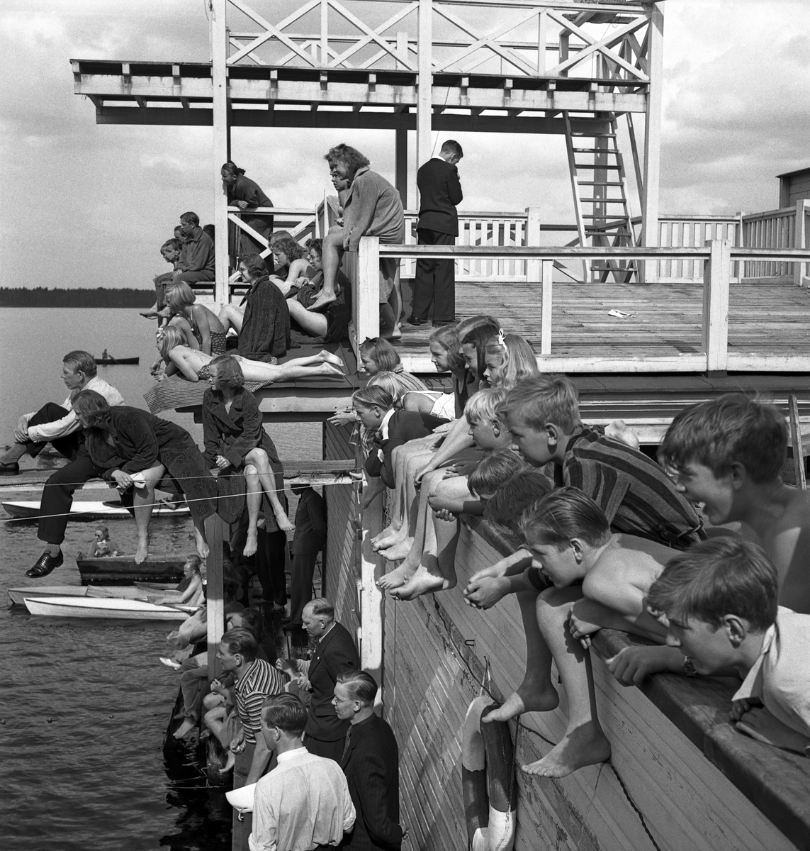 Simningen. Publikbild från badhusets läktare m.m. under tävling.