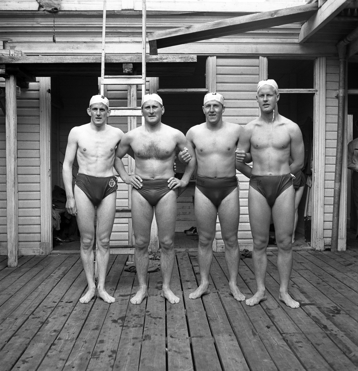 Simningen. Några av de tävlande herrarna utanför dåv. badhuset på Evedal.