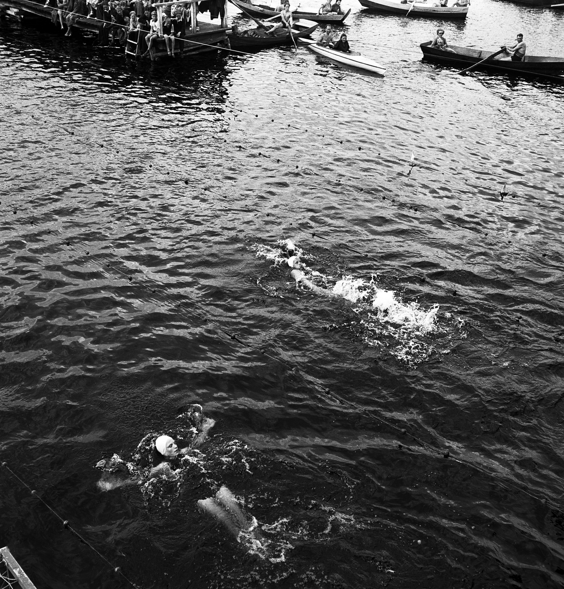 Simningen. Två simmerskor tävlar i ryggsim.