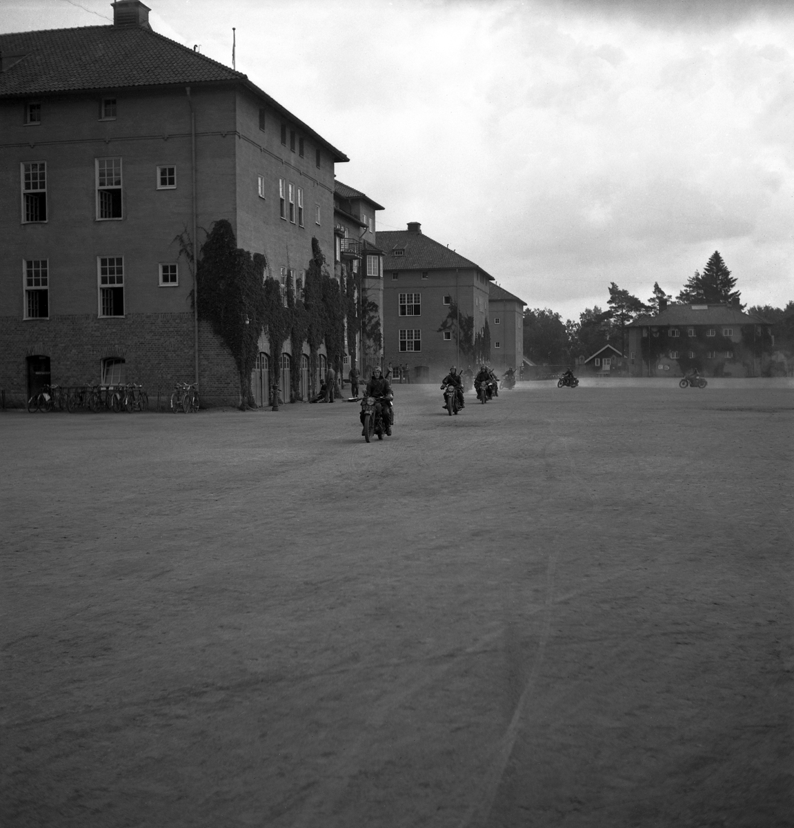 Några män på motorcyklar är på väg ut från kaserngården, I 11, Växjö.