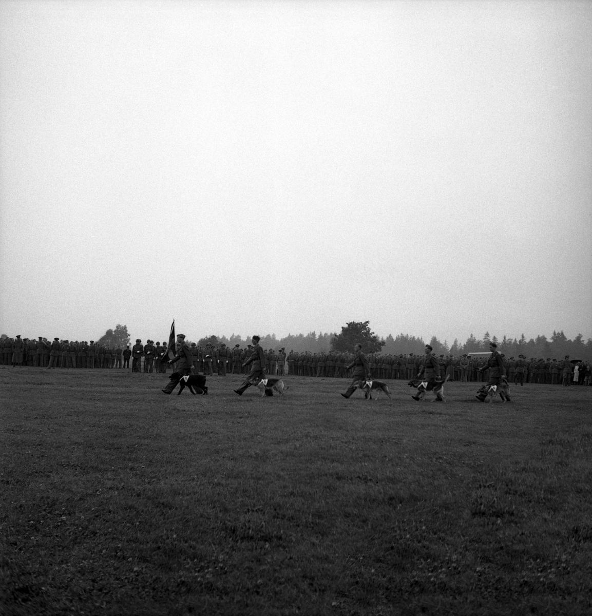 Försvarets dag. Foto av hunduppvisning med schäfrar på övningsfältet (i regnväder.)