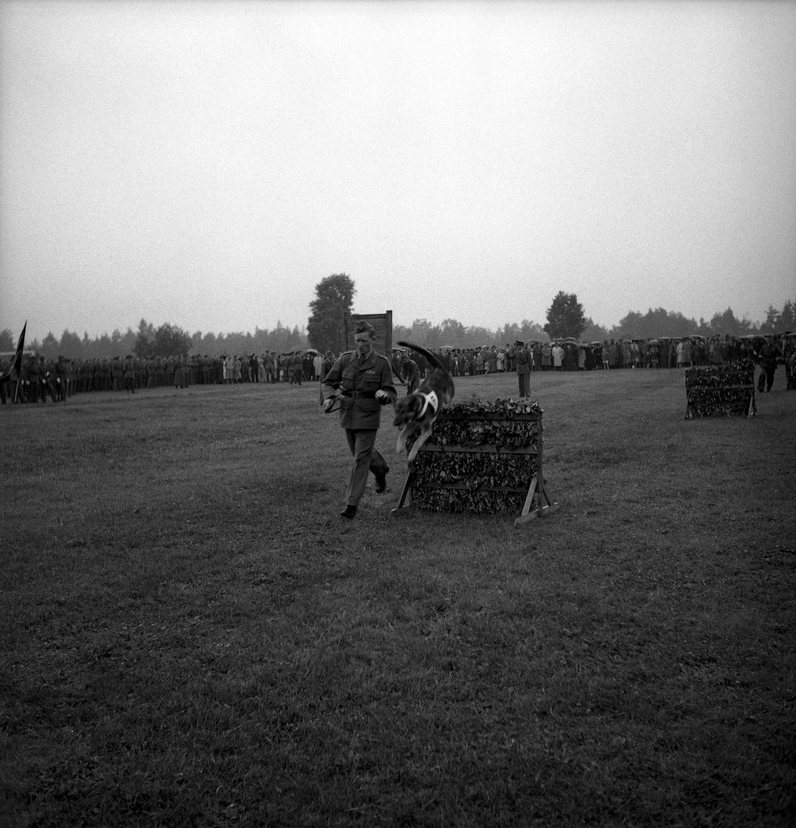 Försvarets dag. Foto av hunduppvisning med schäfrar på övningsfältet (i regnväder.)