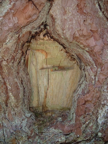 Foto av tjärtall, närbild. Spår efter sk tjäruväckeri, där levande tallar skattades på tjärved. Tydliga huggspår.