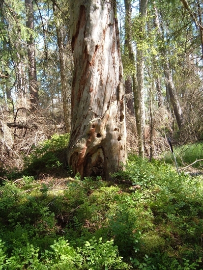 Foto av tjärtall, närbild. Spår efter sk tjäruväckeri, där levande tallar skattades på tjärved. Tydliga huggspår.Tallen är död sedan länge.