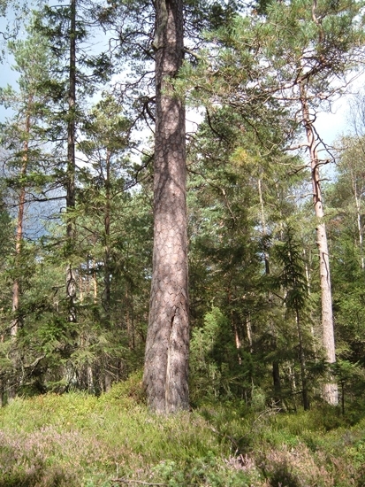 Foto av tjärtall. Spår efter sk tjäruväckeri, där levande tallar skattades på tjärved.