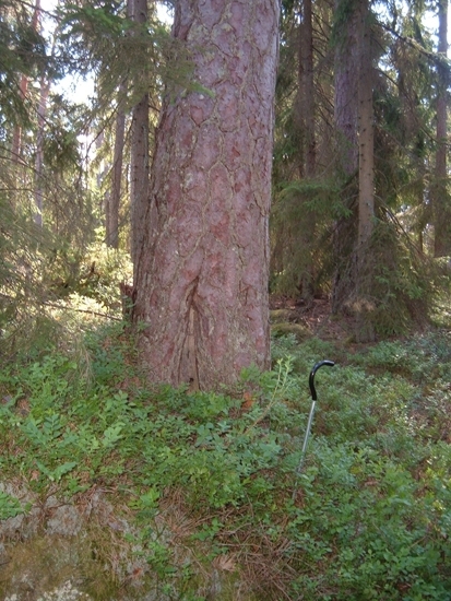 Foto av tjärtall, västra sidan. Spår efter sk tjäruväckeri, där levande tallar skattades på tjärved. Tydliga huggspår. Atypisk med huggspår på 2 sidor.