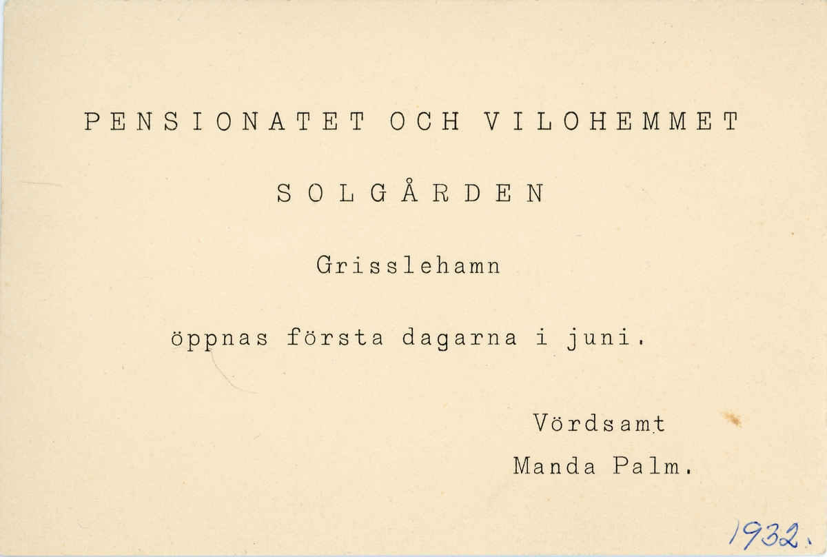 Visitkort med tryckt text "PENSIONAT OCH VILOHEMMET SOLGÅRDEN Grisslehamn öppnas första dagarna i juni. Vördsamt manda Palm." och handskrivet 1932.