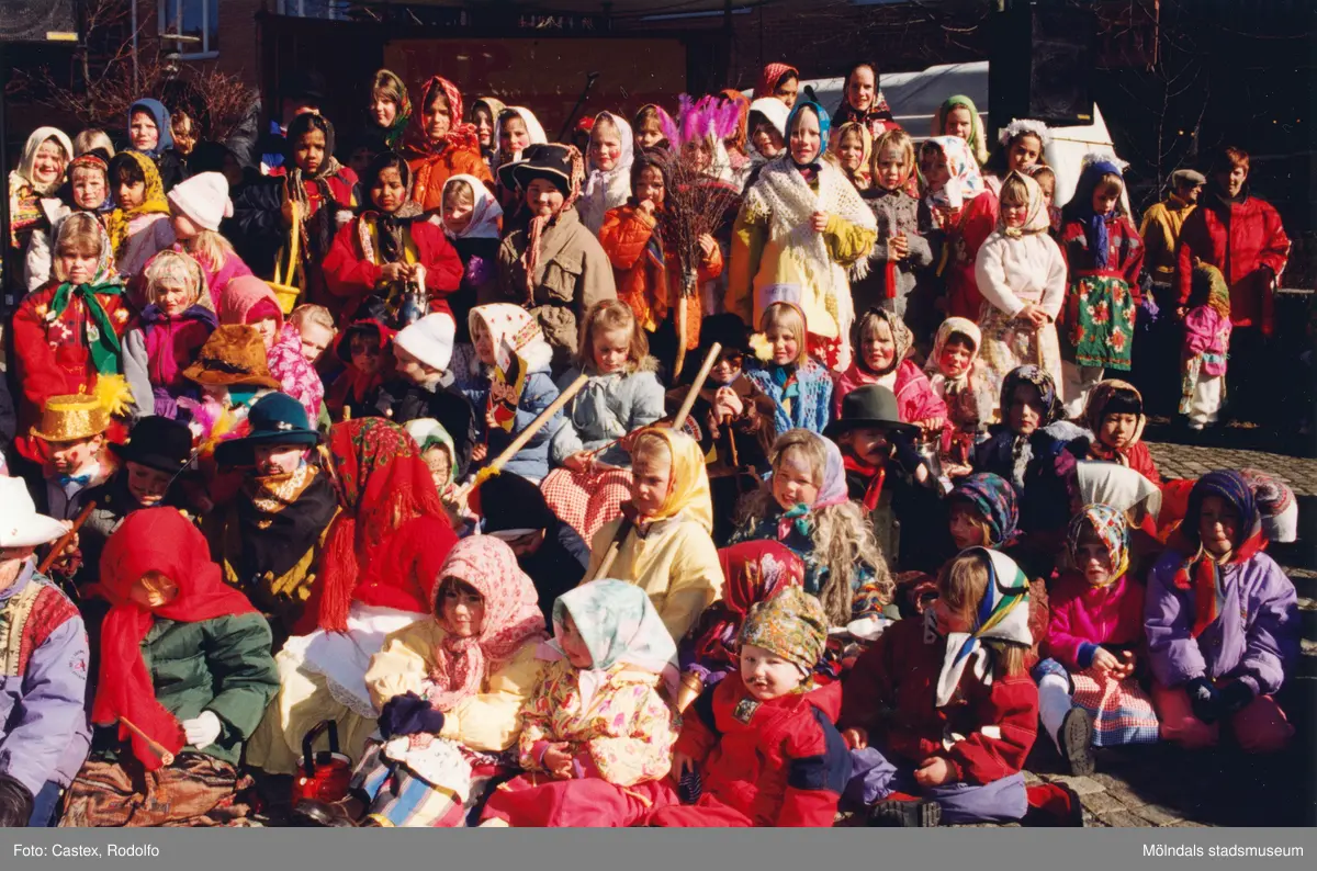 Påskfirande på Mölndals torg i mars 1997. Porträtt av en mängd påskkärringar och påskgubbar.