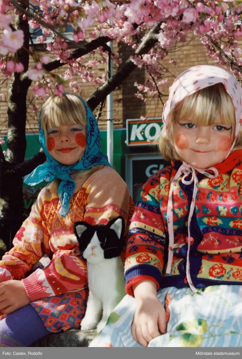 Påskfirande på Mölndals torg i april 2000. Porträtt av två påskkärringar.