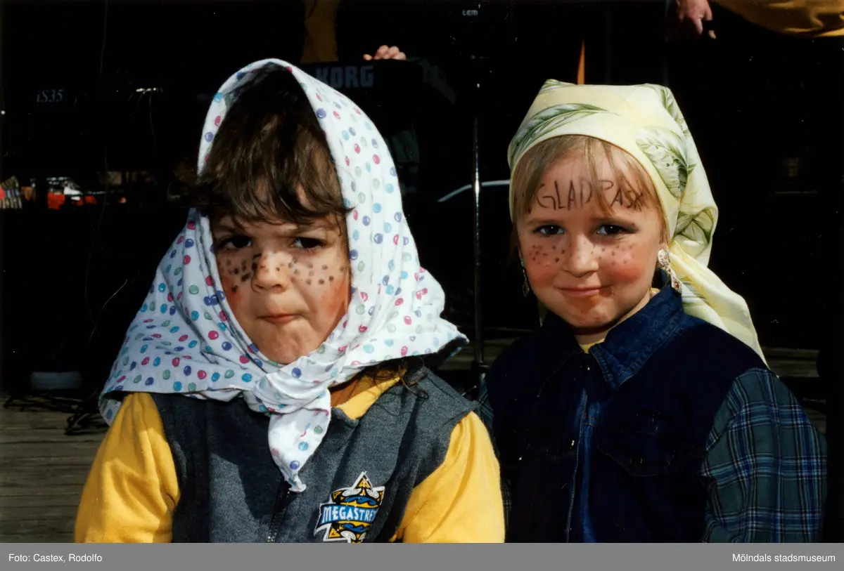 Påskfirande på Mölndals torg i april 2000. Porträtt av två påskkärringar.