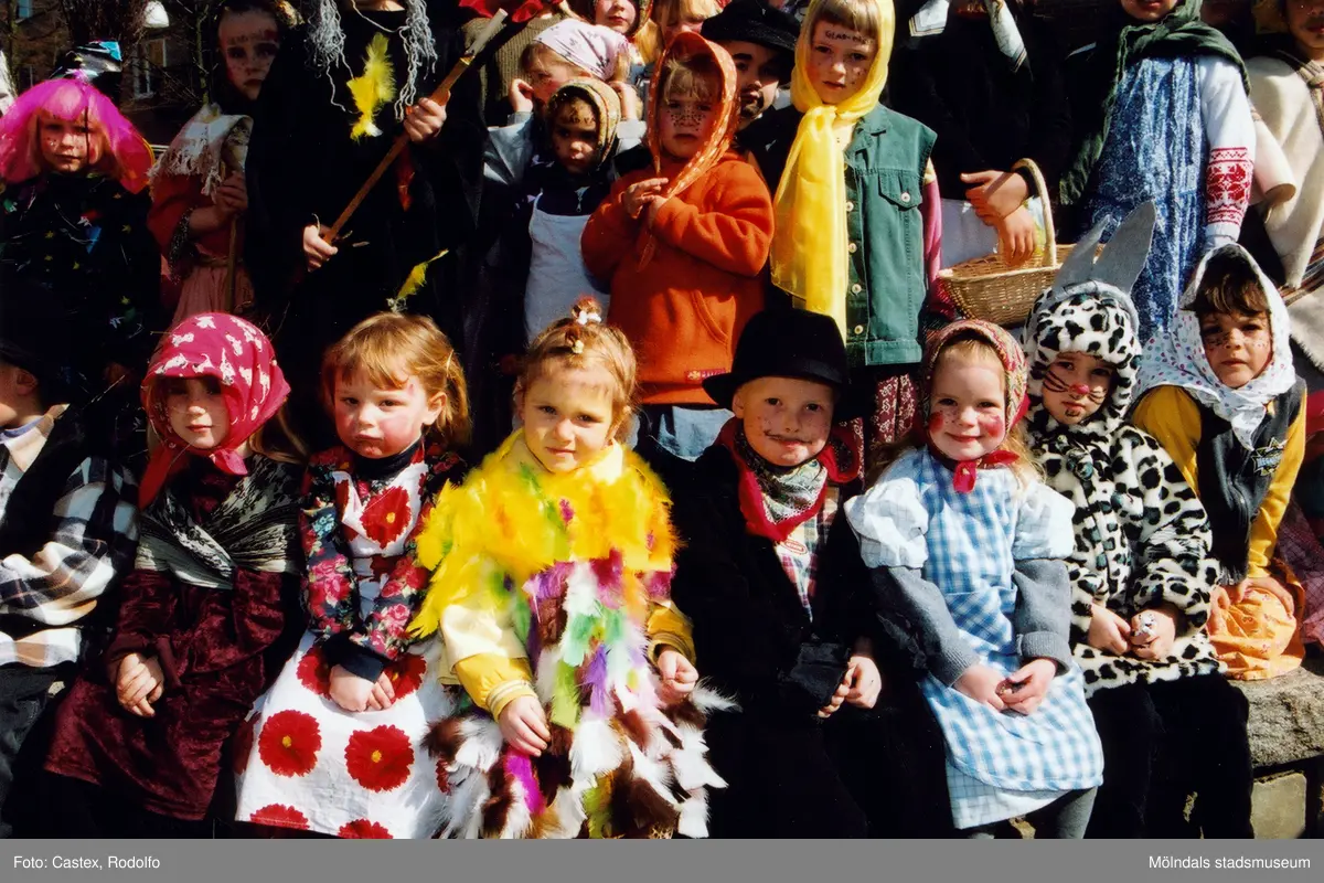Påskfirande på Mölndals torg i april 2000. Porträtt av en mängd påskkärringar och påskgubbar.