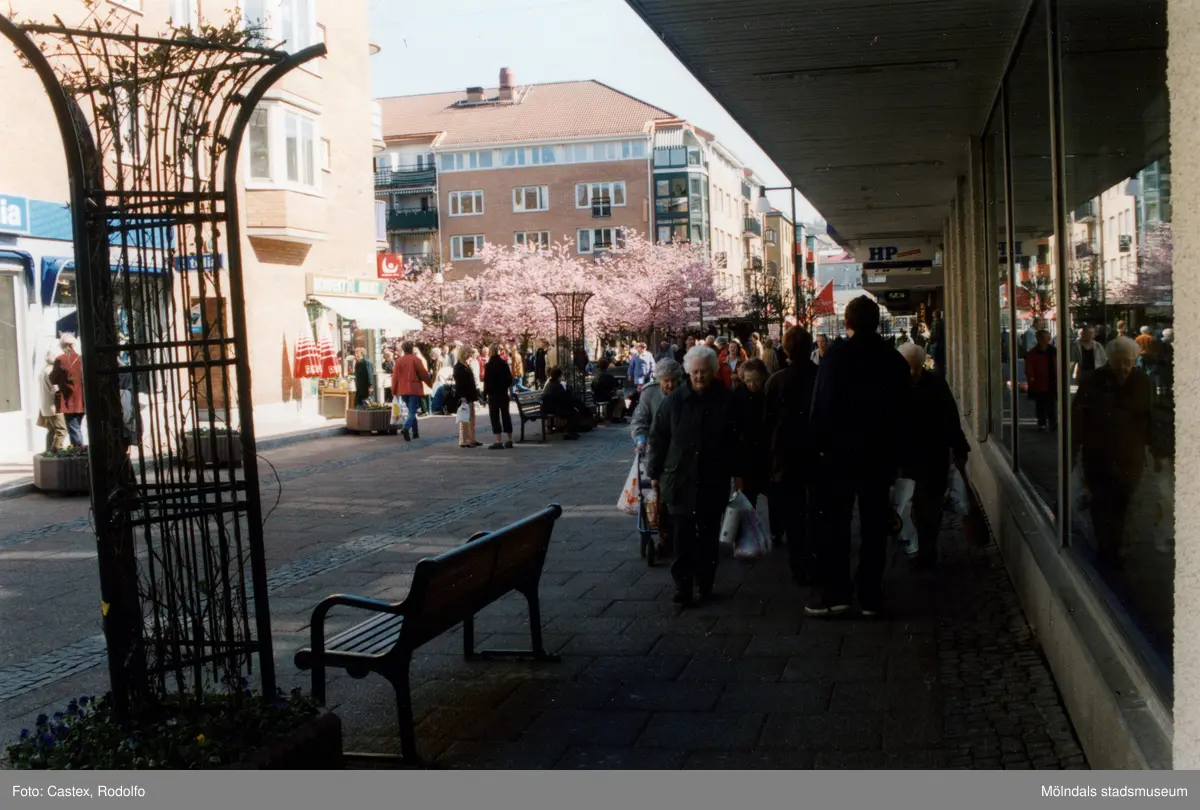 Gågatan Brogatan i Mölndals centrum i april 2000. Vy mot öster.