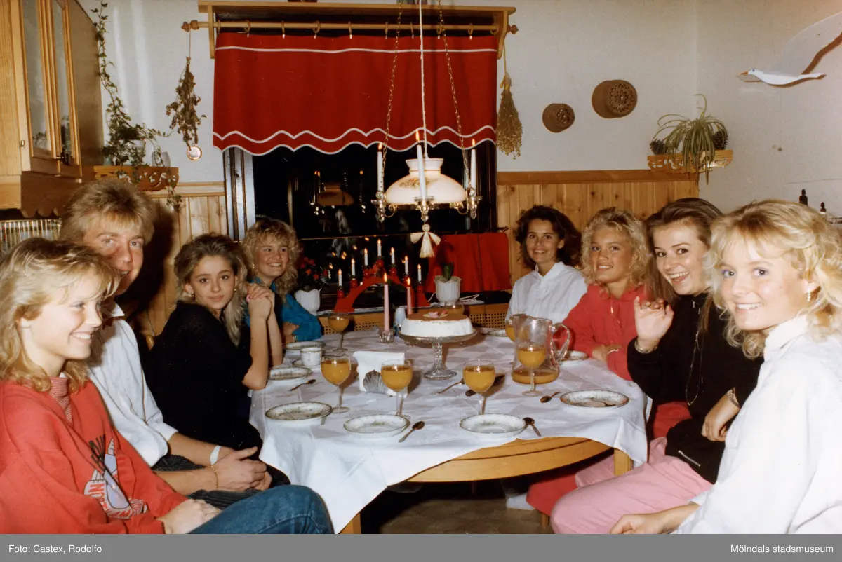 Mölndals Lucia och luciatärnorna sitter kring ett matsalsbord, december 1985.