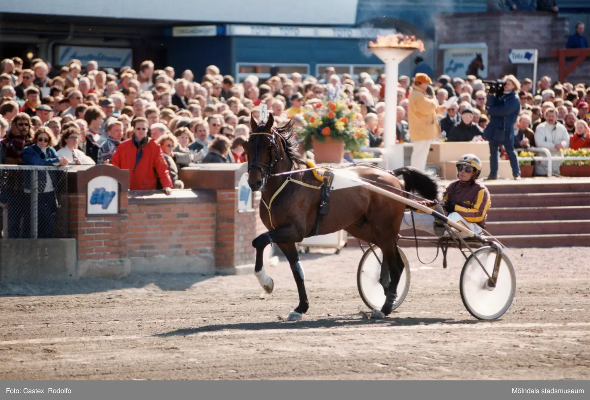 Travloppet Olympiatravet på Åbytravet i Åby, Mölndal, den 13 april 1996. Ett travekipage på travbanan. Segrade gjorde Erik Berglöf med Copiad.
