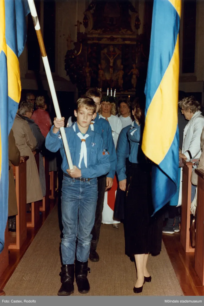 Kröningen av Mölndals Lucia i Fässbergs kyrka i december 1985. Lucian och tärnorna tågar ut ur kyrkan. Före går två scouter som fanbärare.