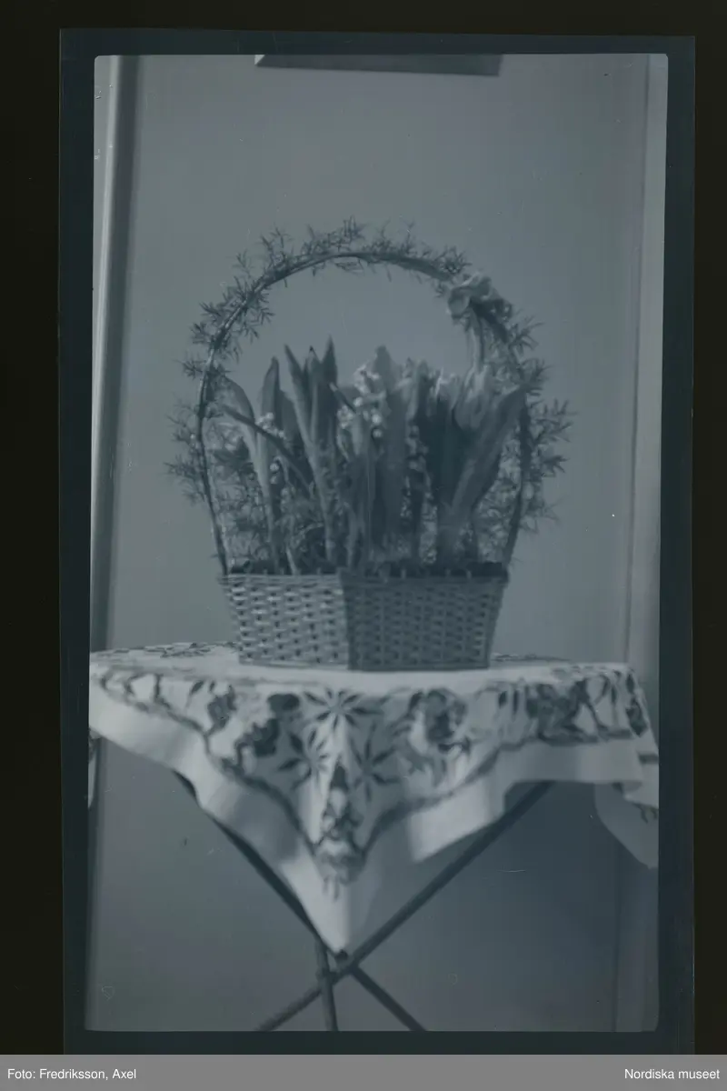 Tulpaner och liljekonvalj i en korg på ett litet bord.