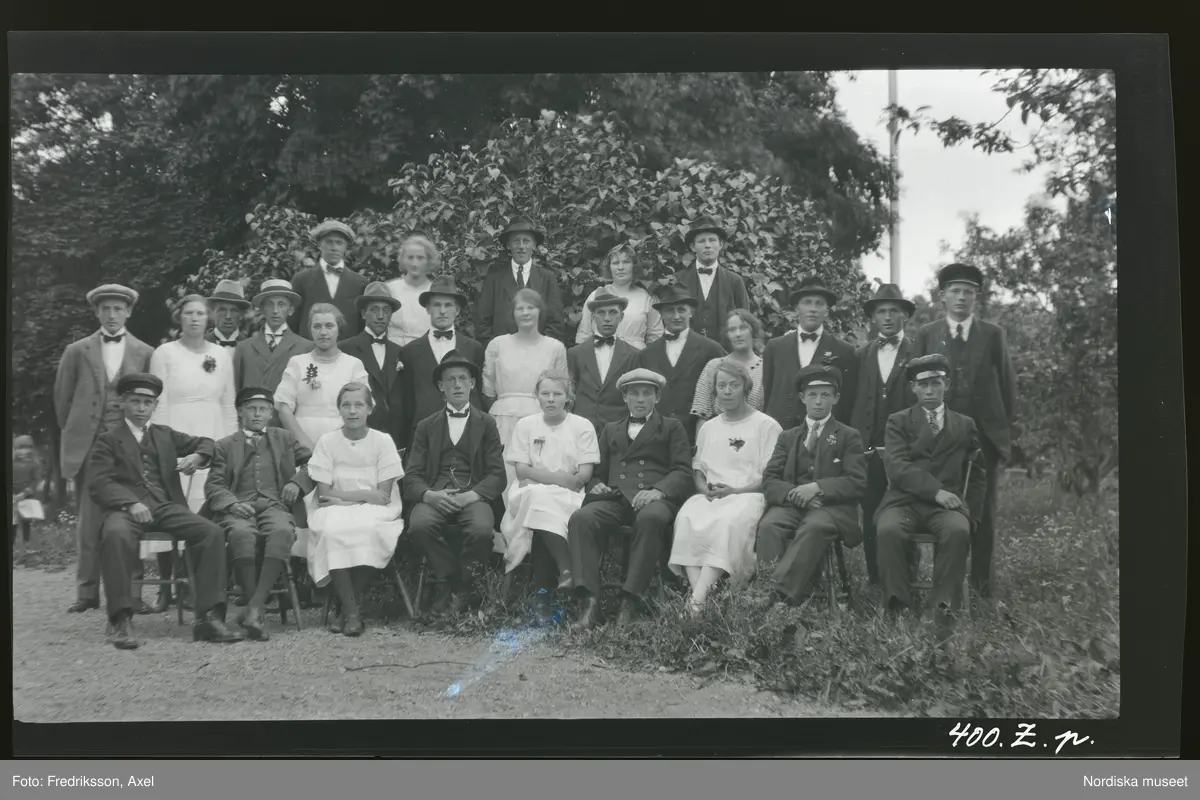 Grupporträtt av ett sällskap unga människor, fotograferade utomhus.