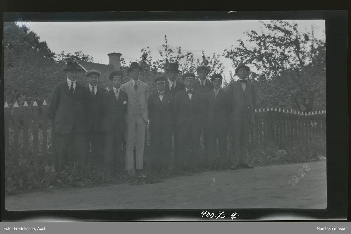 Grupporträtt av några unga män, ståendes på rad utomhus vid ett staket.