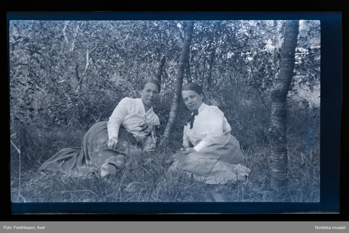 Två kvinnor halvligger avslappnat i gräset.
