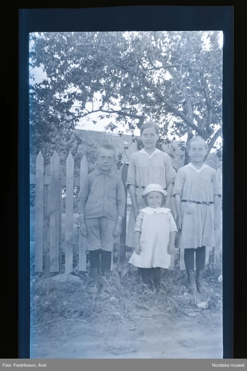 Fyra barn poserar vid ett staket.