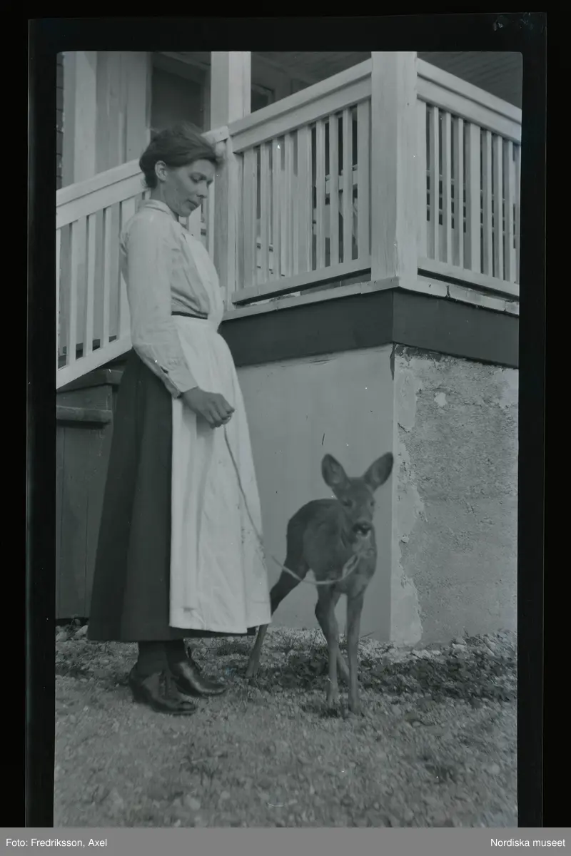 En kvinna står utanför ett hus med ett rådjur i koppel.