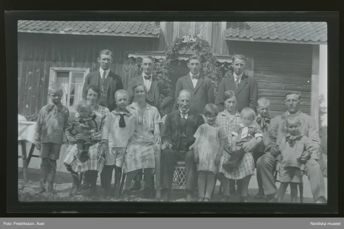 Grupporträtt. Kvinnor, män och barn poserar på framför ett hus. Bakom dem vid ytterdörren står en lövad båge med siffrorna '10 År' högst upp.