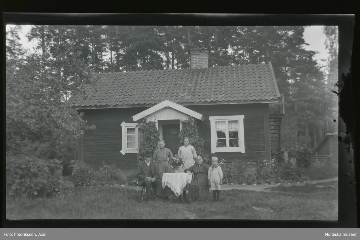 En familj poserar framför sitt hus, det äldre paret sitter vid ett litet bord med duk och blommor i vas.