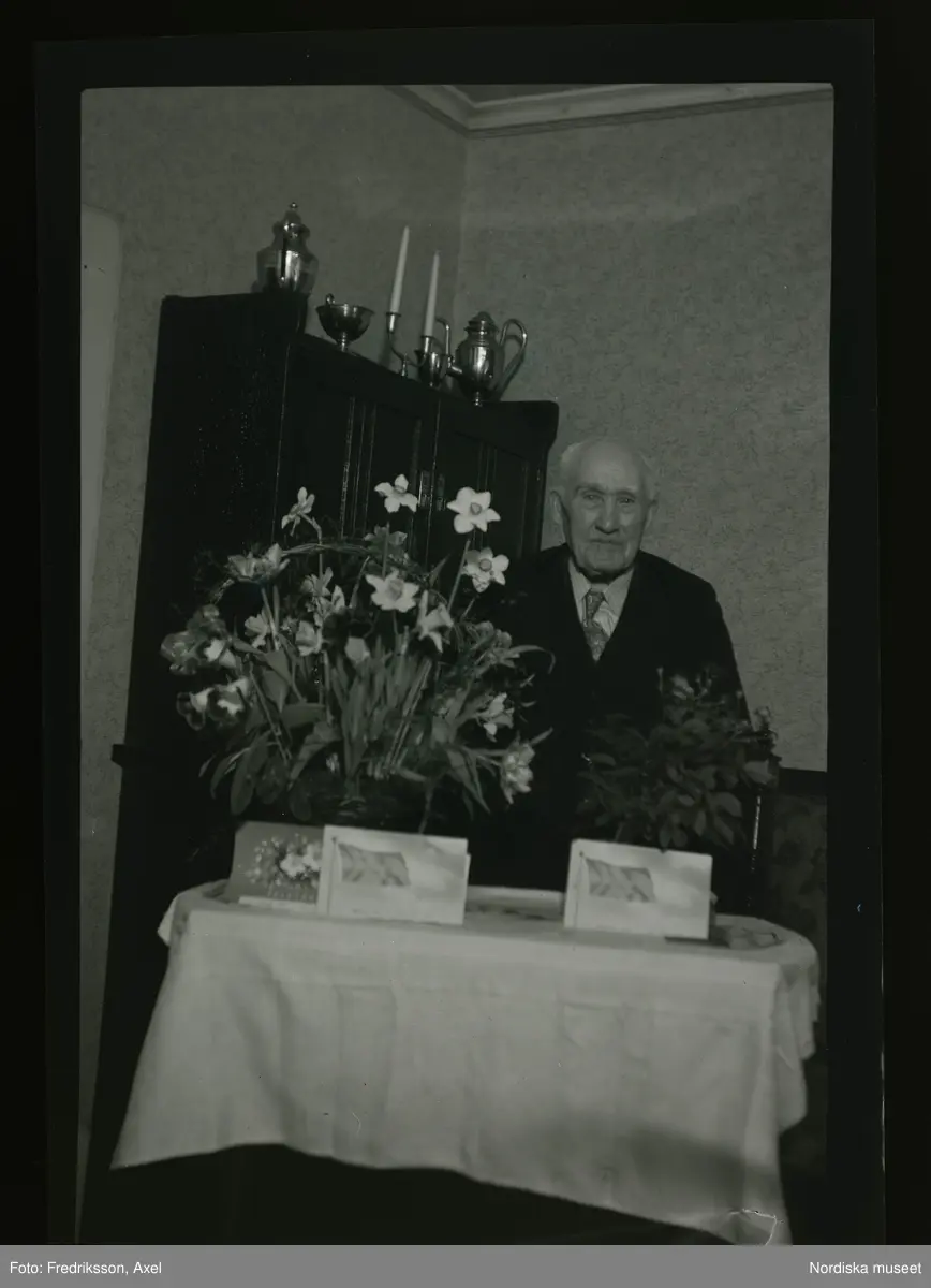 Porträtt av en man som sitter vid ett bord fullt av gratulations-blommor.