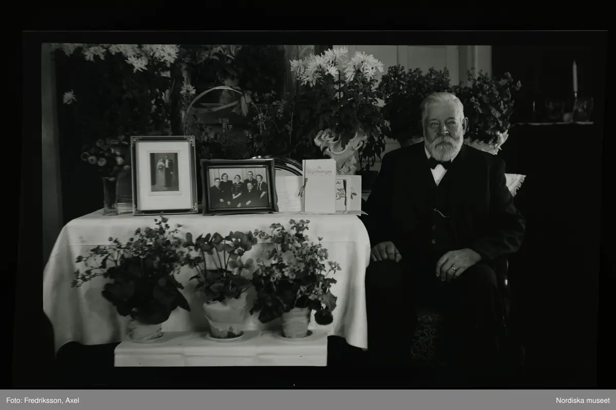Porträtt av en man som sitter vid ett bord fullt av gratulations-blommor.
