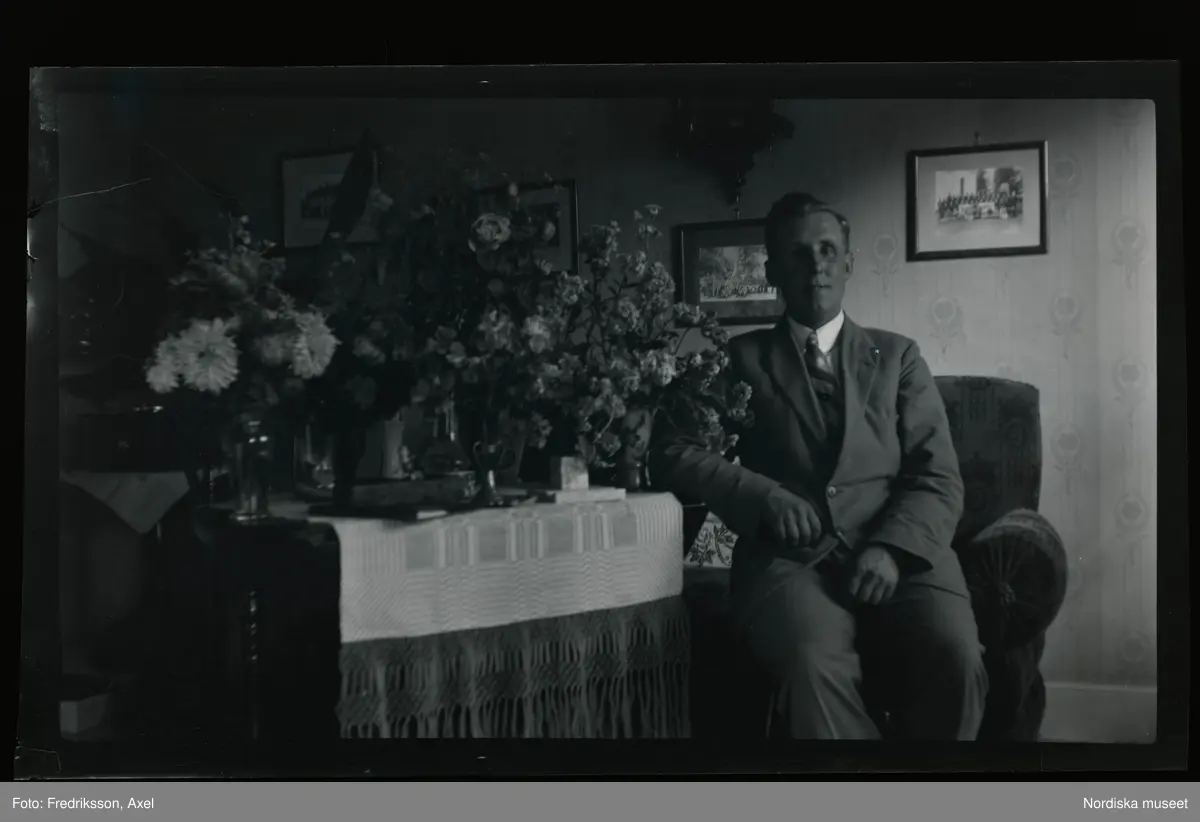 Porträtt av en man som sitter vid ett bord fullt av gratulations-blommor.