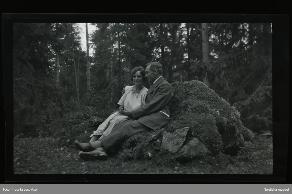 Ett par sitter på en stor sten i skogen och håller om varandra.