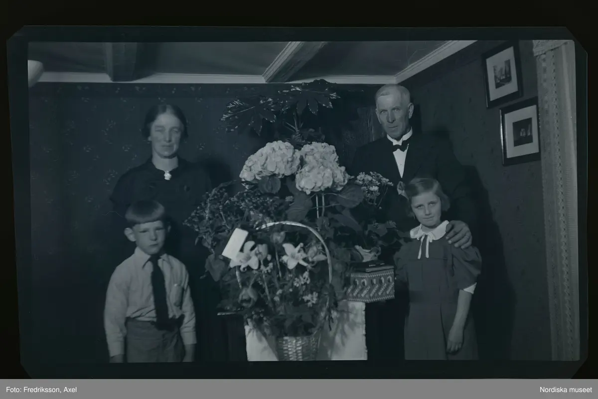 Porträtt av en familj som står vid ett bord fullt av gratulations-blommor.