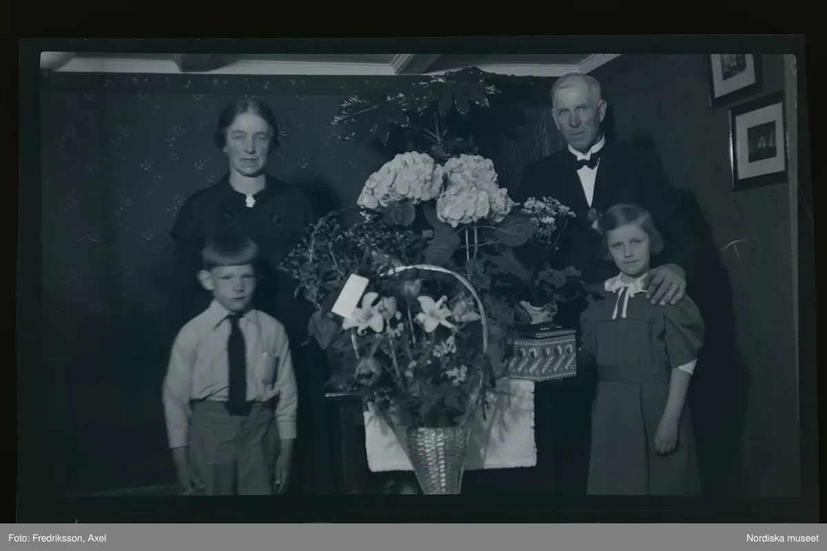 Porträtt av en familj som står vid ett bord fullt av gratulations-blommor.