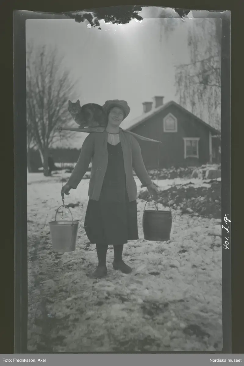 En kvinna bär ett ok med två hinkar vatten. På hennes axel sitter en katt.