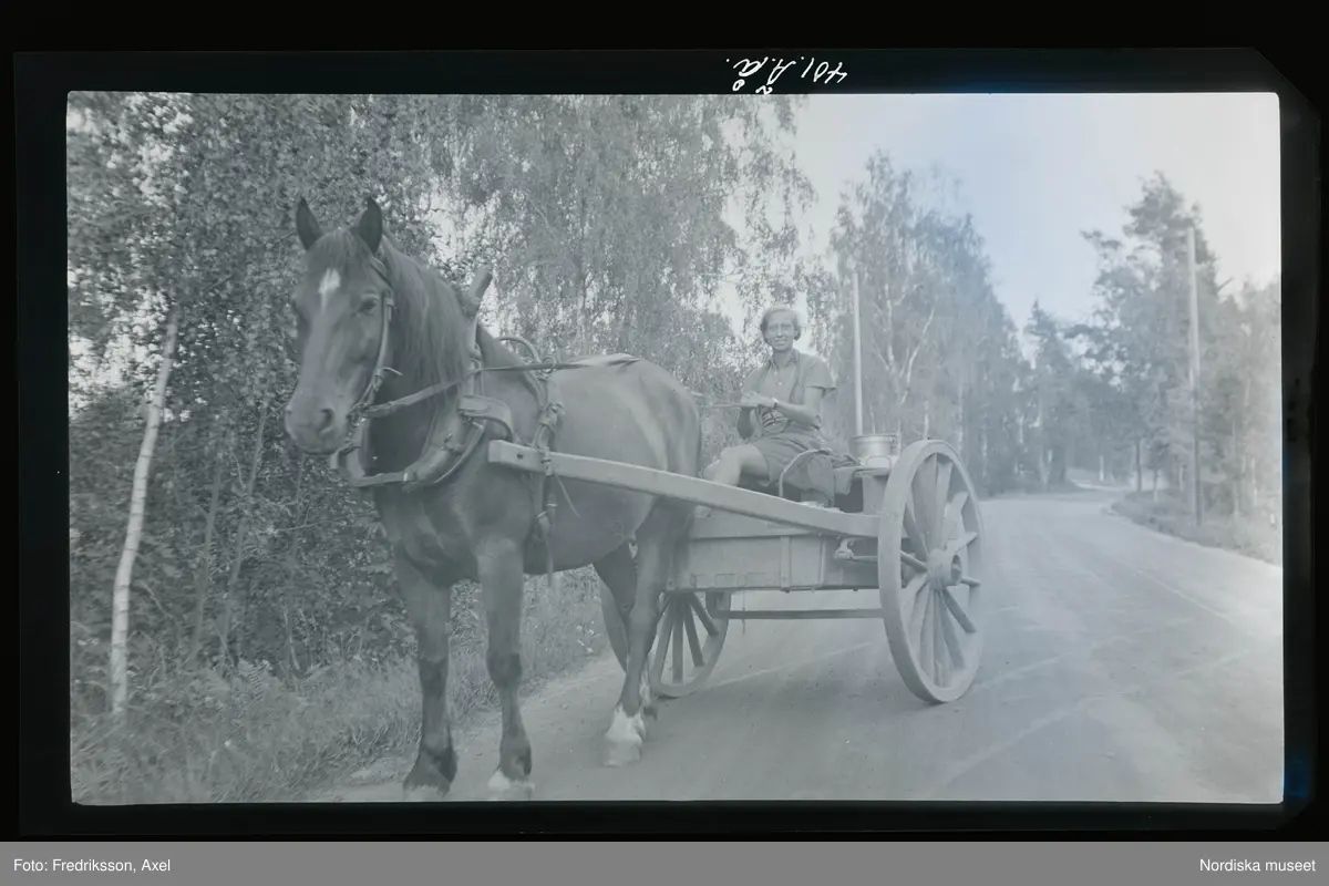 Ung kvinna kör häst och vagn.