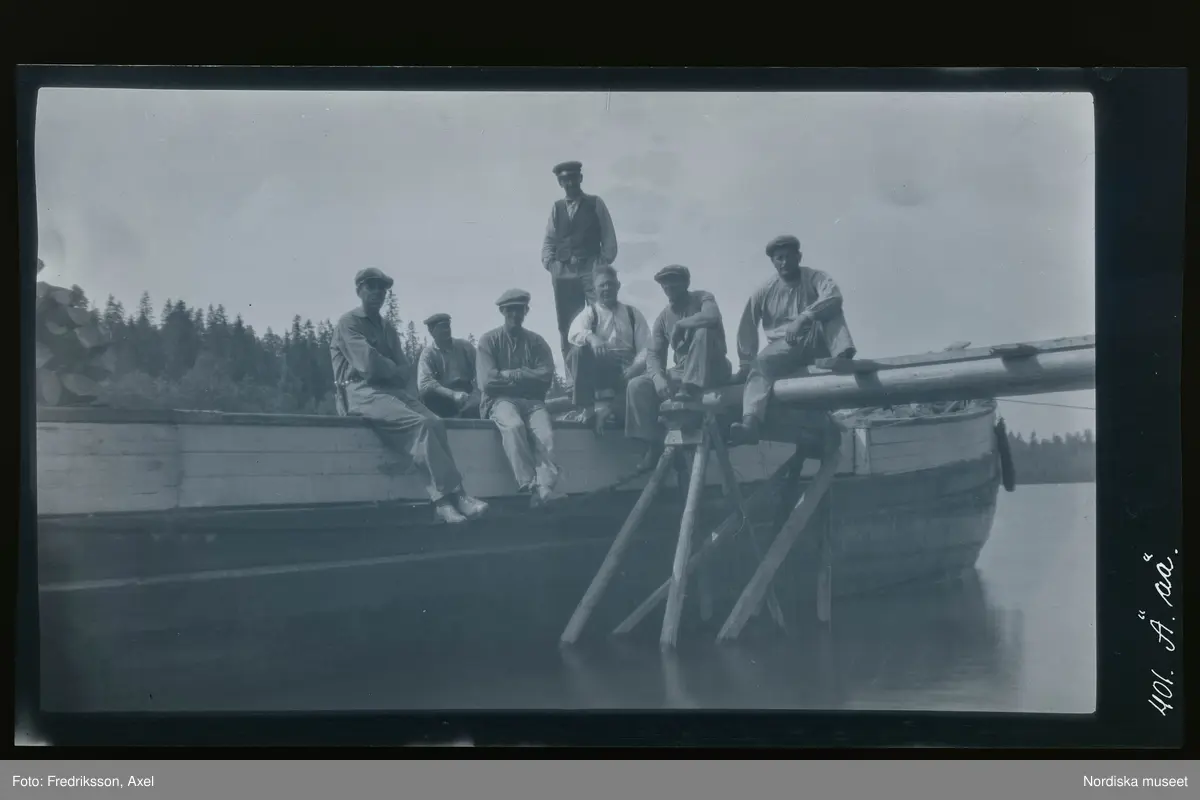 Ett arbetslag sitter på en båt. Axel Fredriksson längst till höger.
