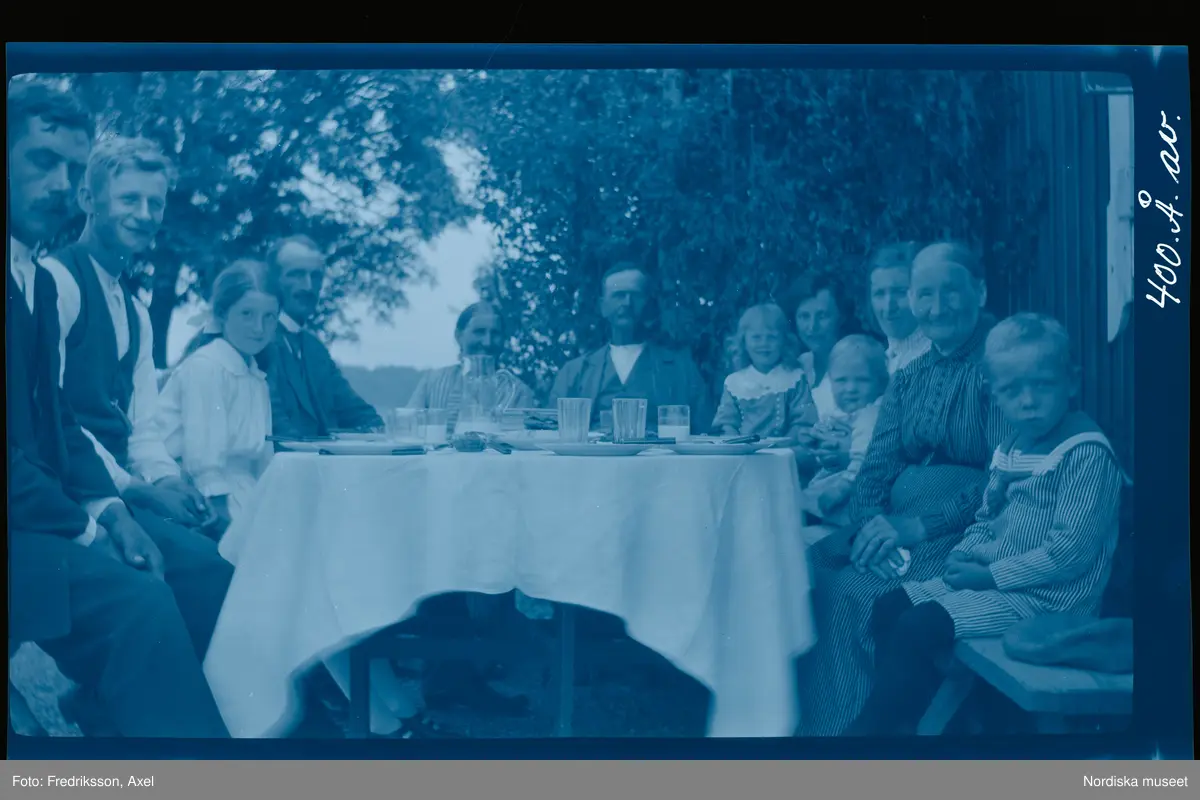 Ett sällskap vuxna och barn kring ett dukat bord ute i en trädgård.