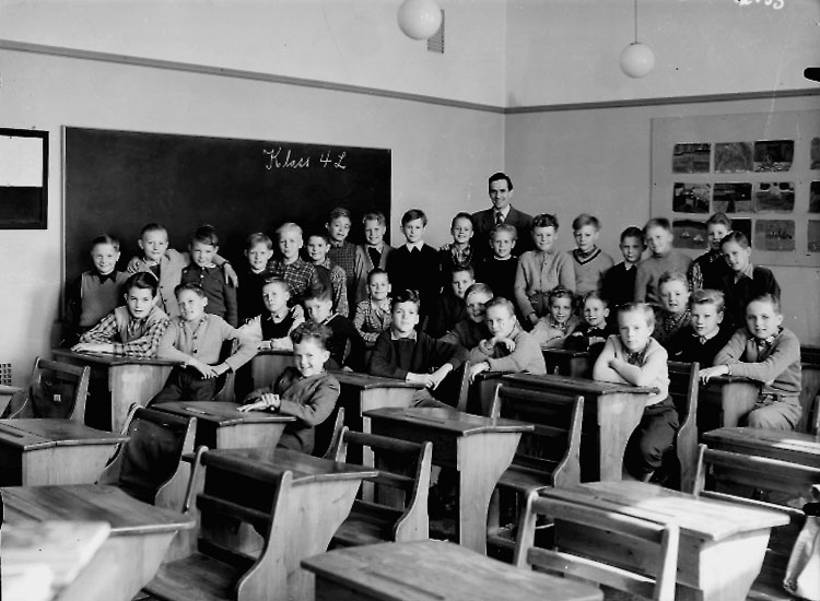 Engelbrektsskolan, klassrumsinteriör, 33 pojkar med lärare Arne Åhman.