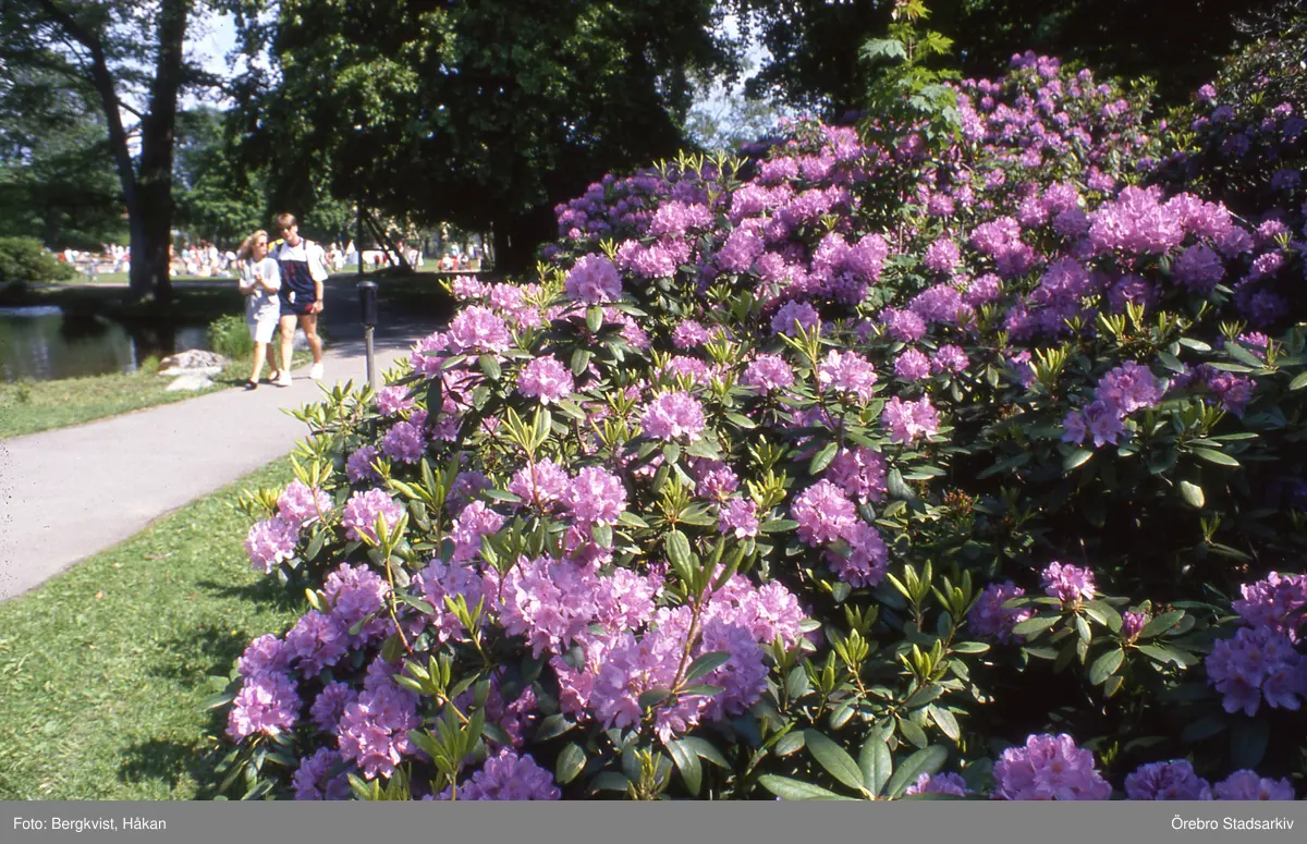 Besökare i stadsparken vid buskar med Rhododendron, 1989