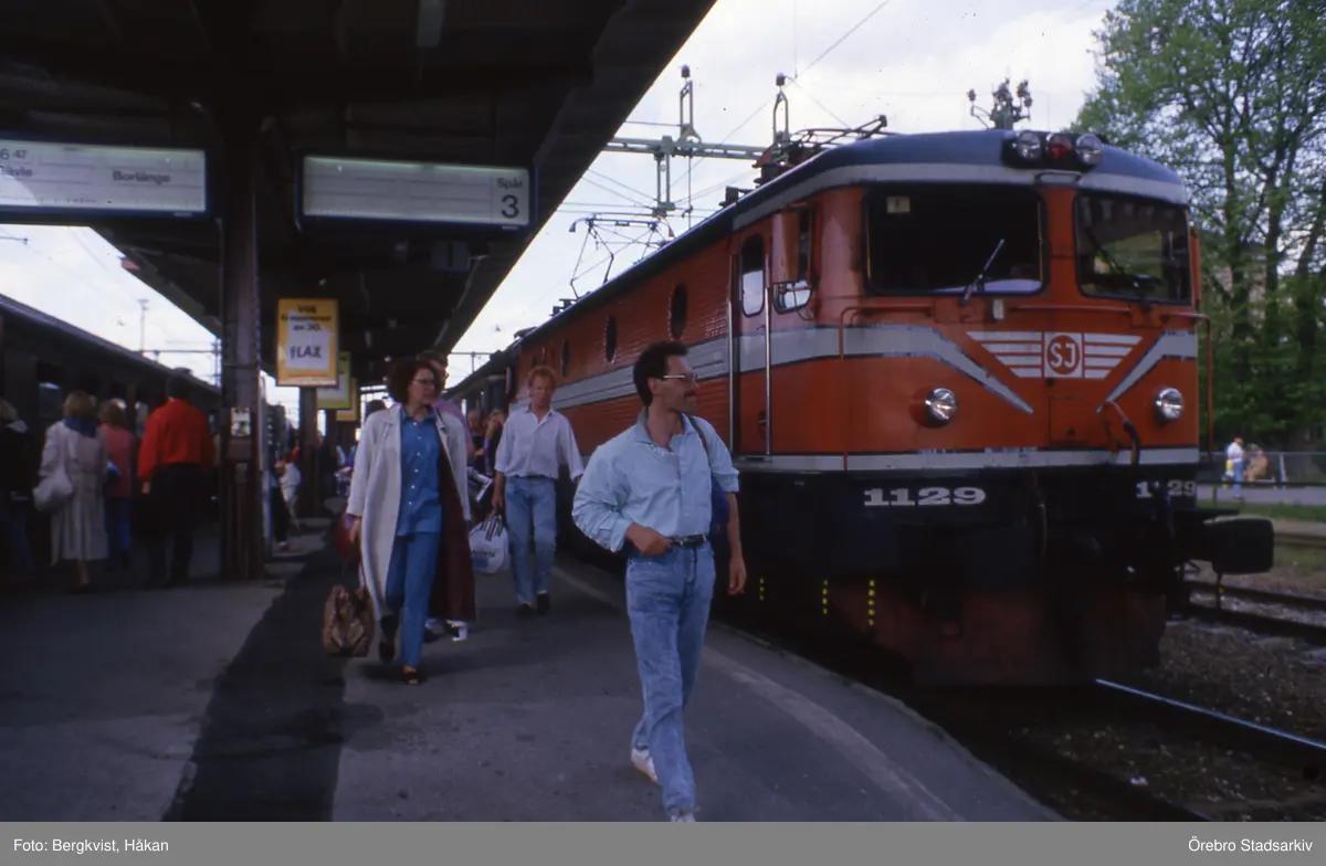 Passagerare lämnar tåg draget av lok 1129 på Örebro centralstation, 1989