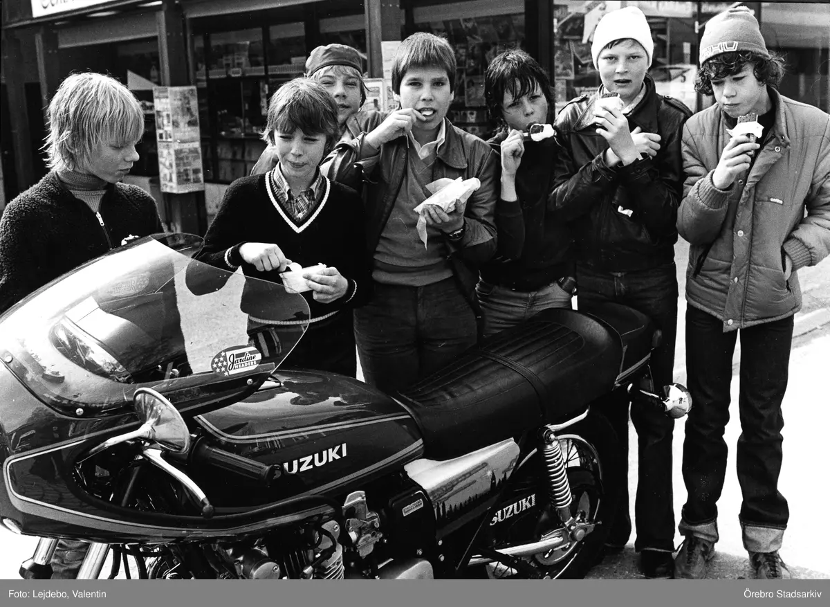 Ett gäng pojkar beundrar en motorcykel, 1970-tal