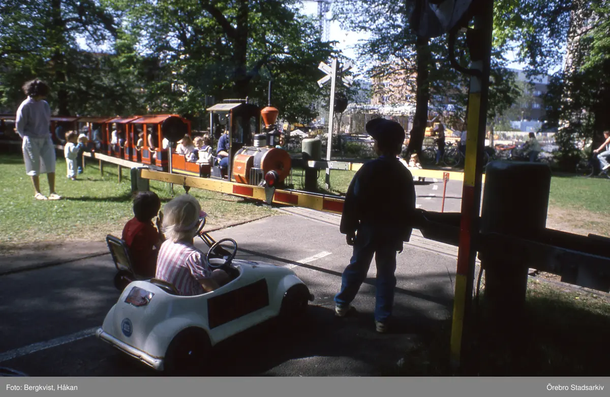 Trampbilar väntar vid jänvägsbommar på Stora Holmen då lilleputtåget ska passera, 1989