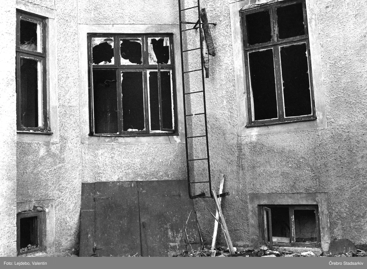 Sönderslagna fönster på rivningshus på Gustavsgatan 17, 1980-tal
