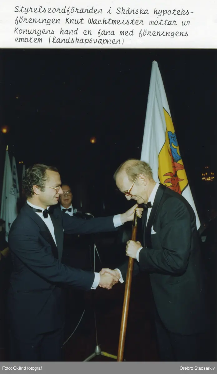 Fana mottages ur Kungens hand vid stadshypoteksens 125-årsjubileum, 1986-09-23