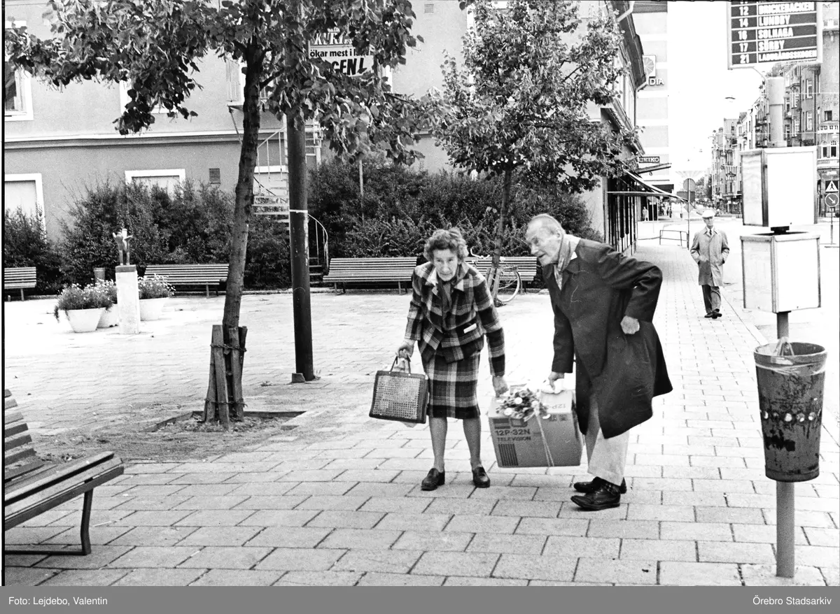 Äldre par vid busshållplats på Teaterplan, 1970-tal