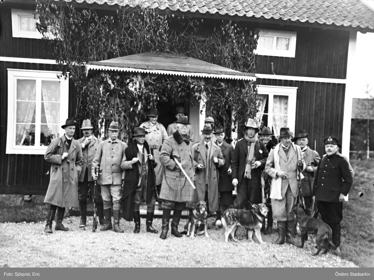 Kungligt jaktlag samlade framför torp, 1940-tal